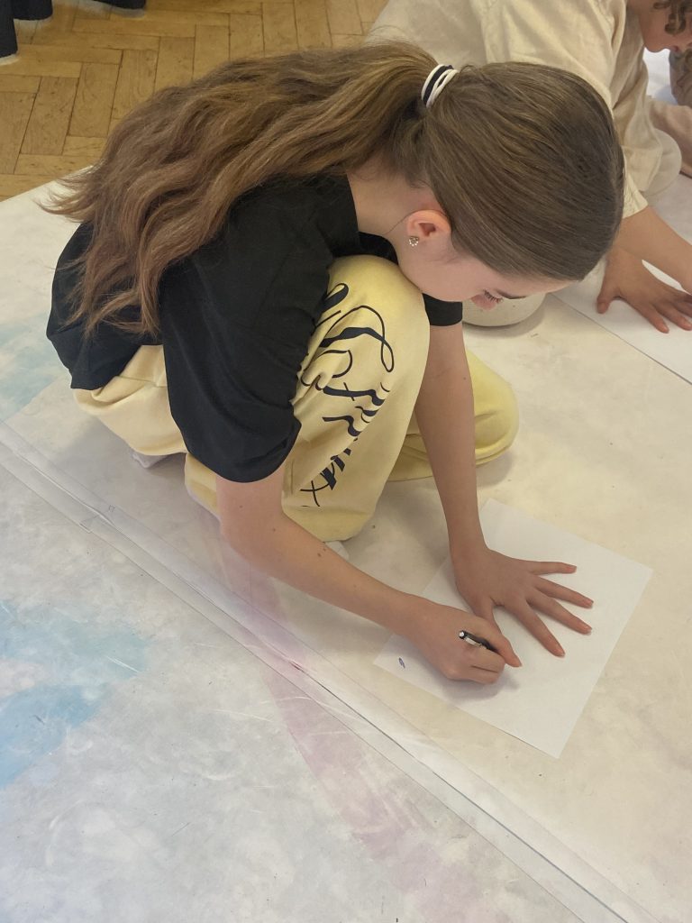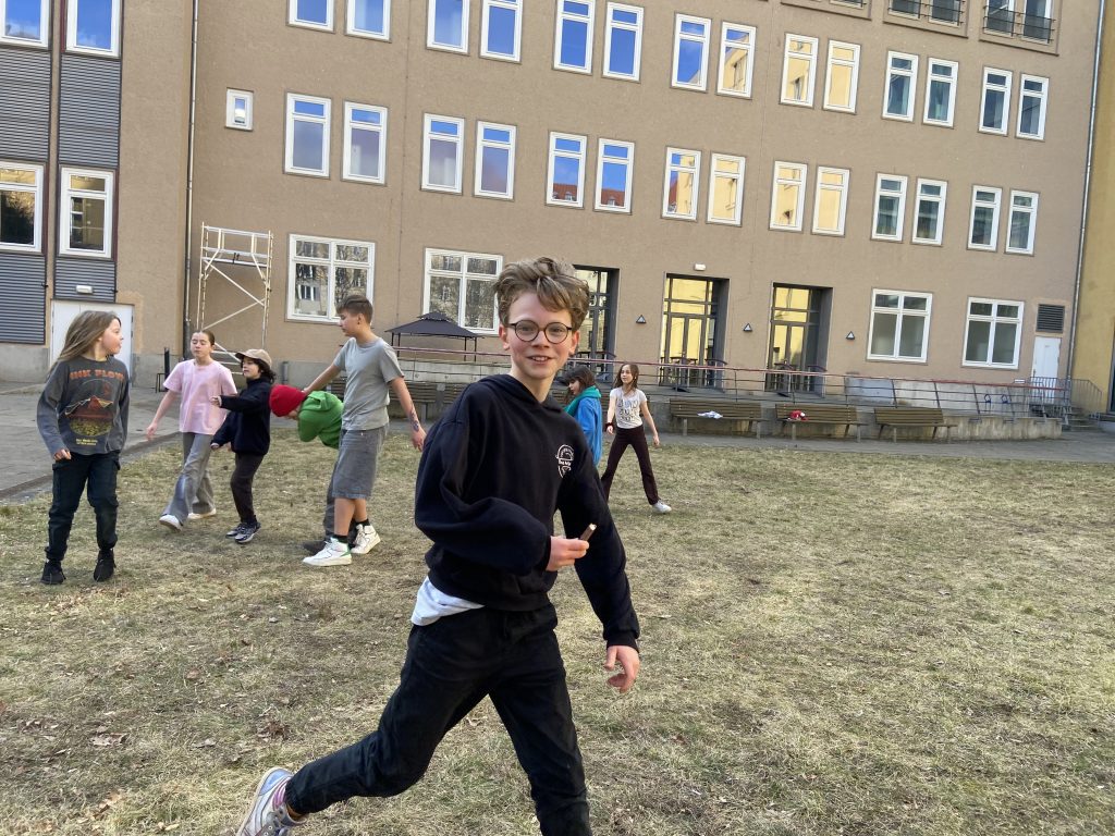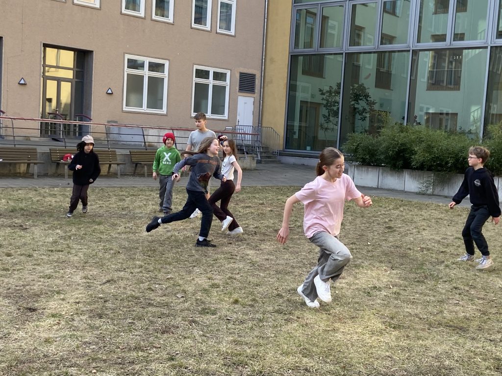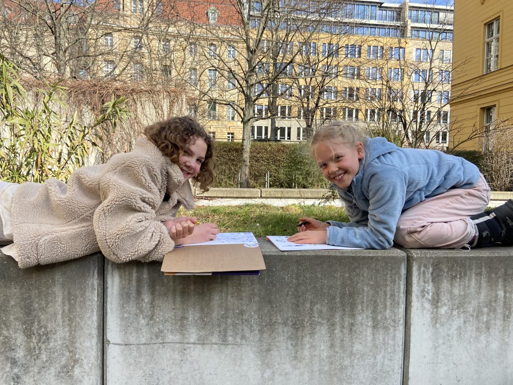 Das Recht auf Freizeit und mehr Pausen: Hier sind wir! Die Projekthefte konnten in der Sonne weiterbemalt werden und es wurde Fangen gespielt.