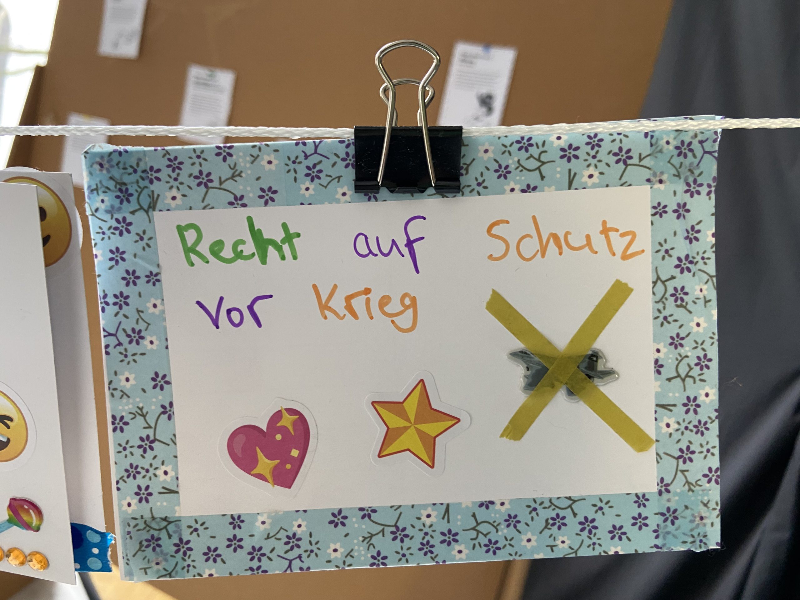 Mit Lea vom Netzwerk zur Umsetzung der UN- Kinderrechtskonvention National Coalition Deutschland wurde viel entdeckt und ausprobiert. Die Gruppe hat Kinderrechte auf einem Wimmelbild gefunden, Postkarten zu Kinderrechten gebastelt, ein Hörspiel über Kinderrechten gehört und viel diskutiert: